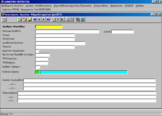 Περιλαμβάνει την καταχώρηση παραμέτρων για χρήση ακινήτων, στοιχεία δήμου, παραστατικά, φάσεις απαλλοτρίωσης, χαρακτηριστικά – status κτιρίου κ.α.