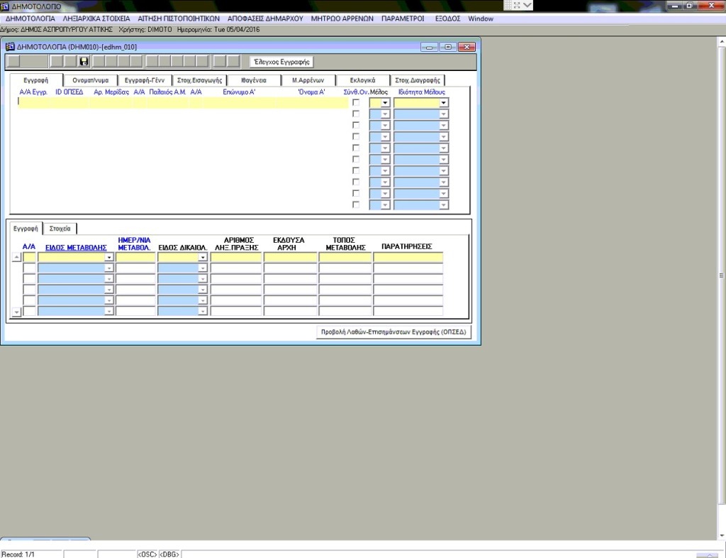 Οι νέες εγγραφές και οι διορθώσεις των Βιβλίων Δημοτολογίου καταχωρούνται στο πρόγραμμα Διαχείρισης Στοιχείων Δημοτολογίου ενώ οι Ληξιαρχικές Πράξεις στο αντίστοιχο πρόγραμμα Διαχείρισης Ληξιαρχικών Στοιχείων. Στη συνέχεια με βάση τα παραπάνω στοιχεία τυπώνονται τα πιστοποιητικά και οι εκτυπώσεις με τις αντίστοιχες επιλογές.