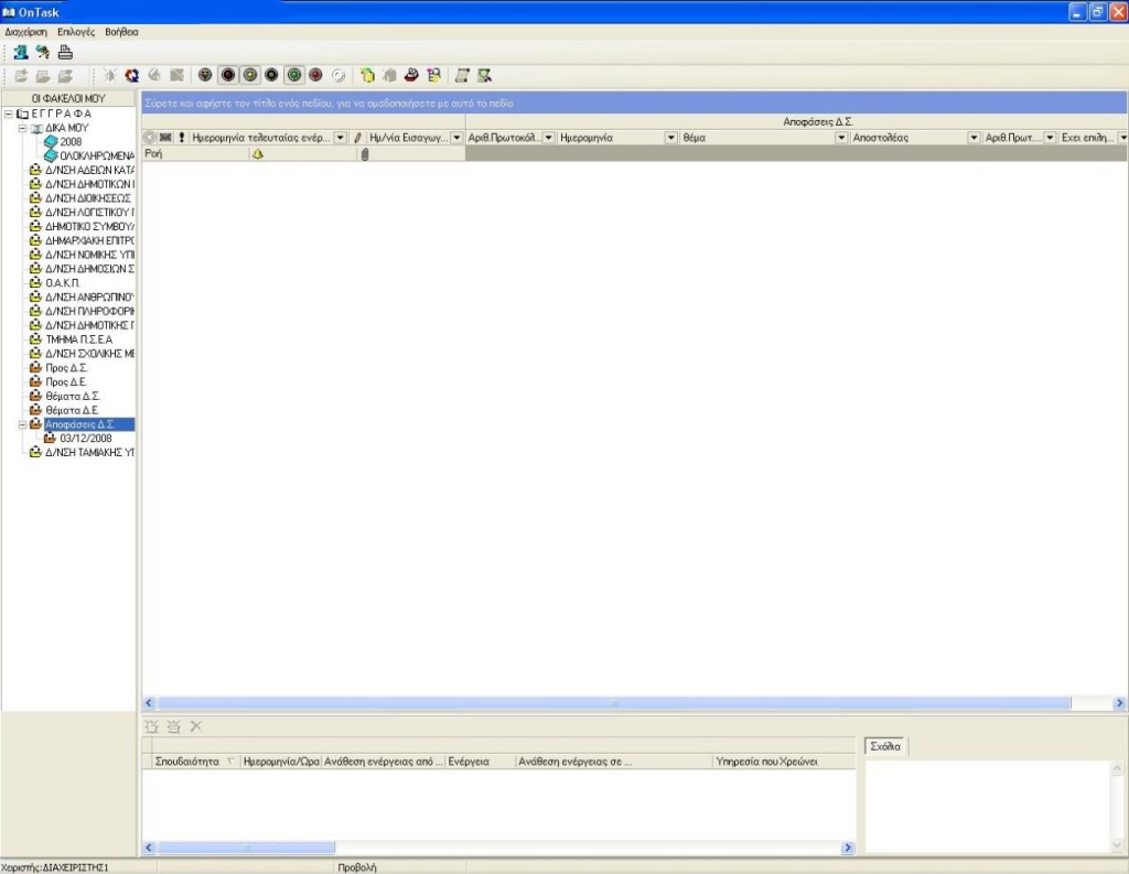 Αντίστοιχα, στην εφαρμογή του OnTask όπου ένας χρήστης παρακολουθεί τη διαδικασία διεκπεραίωσης της απαίτησης ενός εγγράφου, μπορεί επίσης να καταχωρήσει, αποθηκεύσει, τροποποιήσει αλλά και να προβάλει ένα έγγραφο. Και εδώ ο χρήστης μπορεί να πραγματοποιήσει αναζήτηση απλή ή σύνθετη ενώ η επιλογή της διαγραφής είναι διαθέσιμη μόνο σε εκείνους τους χρήστες με το παραπάνω δικαίωμα.