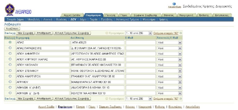 Ακόμη, η εφαρμογή δίνει τη δυνατότητα διαχείρισης ληξιαρχικών στοιχείων (ευρετήριο – εκτύπωση), πίνακα παραμέτρων (ευρετήριο – εκτύπωση) και αρχείου δρόμων.