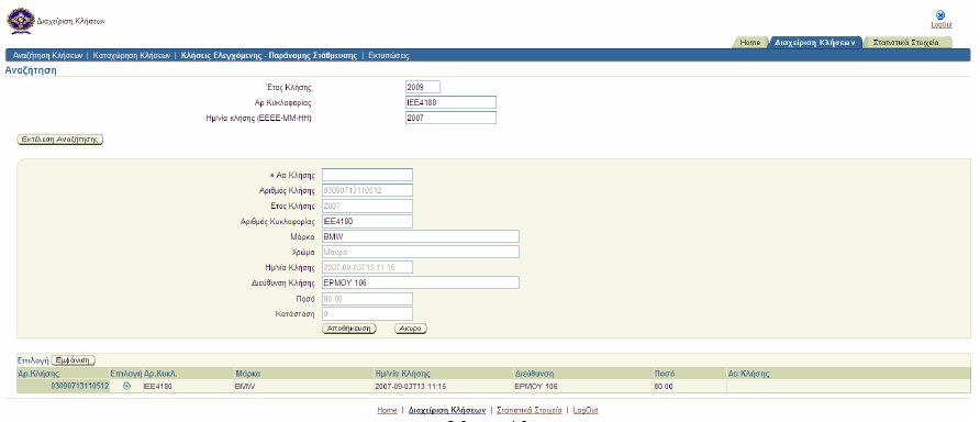 Οι κλήσεις καταχωρούνται στην εφαρμογή με τη συμπλήρωση από το χρήστη πεδίων όπως προέλευση, έτος έκδοσης, Α/α κλήσης, Αρ.κυκλοφορίας, μάρκα, χρώμα οχήματος, ποσό κλήσης, στοιχεία ιδιοκτήτη κλπ. Με την αποθήκευσή της η κλήση λαμβάνει χαρακτηρισμό κατάστασης ‘Απλήρωτη’ και εφόσον πληρωθεί από τον οφειλέτη η κατάστασή της αλλάζει σε Βεβαιωμένη ή Πληρωμένη Οίκοθεν ενώ η πληρωμή εντάσσεται σε Χρηματικό Κατάλογο.