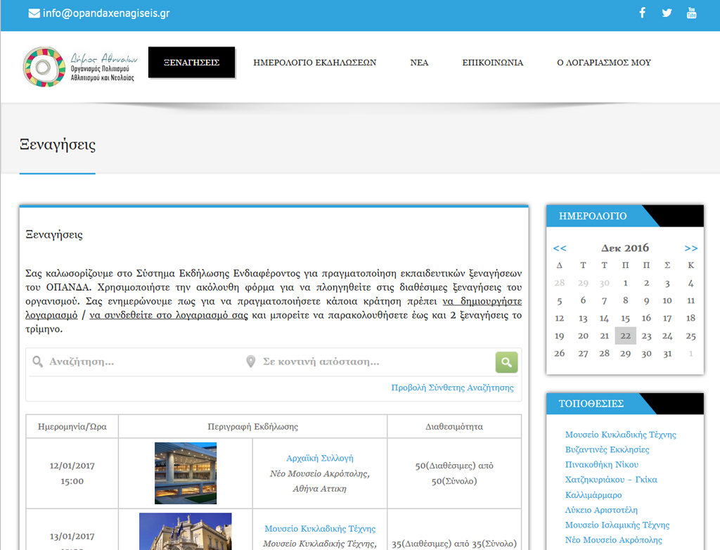 Ένα νέο διαδικτυακό προϊόν της ΔΑΕΜ για τη διαχείριση των δωρεάν ξεναγήσεων που πραγματοποιούνται στην πόλη της Αθήνας, από τον ΟΠΑΝΔΑ. Ο ενδιαφερόμενος, αφού δημιουργήσει το λογαριασμό του και ταυτοποιηθεί ως χρήστης, μπορεί να υποβάλει αίτηση συμμετοχής στις προγραμματισμένες ξεναγήσεις του ΟΠΑΝΔΑ. Στη συνέχεια, μέσα από ένα εύχρηστο διαχειριστικό περιβάλλον, η ομάδα ξεναγήσεων εγκρίνει ή απορρίπτει τις αιτήσεις, ενημερώνοντας διαρκώς τη λίστα συμμετεχόντων κάθε ξενάγησης.